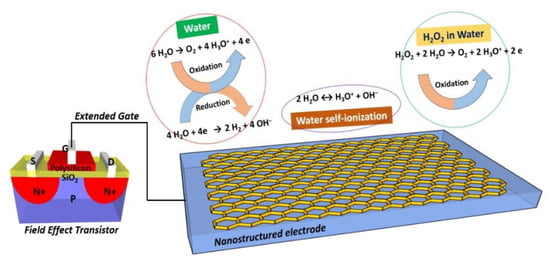 The findings in Figure 6 are supported by a schematic mechanism of H2O2 detection in neutral pH solution as shown in Figure 7. In our FET setup, the interfacial reaction comes from several phenomena [49]. First, it is initiated from the occurrence of water electrolysis events due to the electrical polarization at the surface as follows: