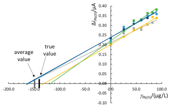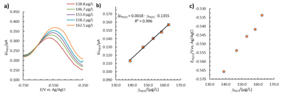 The linear concentration ranges obtained for the SPE and BiFSPE were 171.4–225.0 µg/L and 138.8–162.5 µg/L, respectively. It should be noted that repeat measurements with different SPEs had different linear concentration ranges (depending on each SPE used). However, the linear concentration ranges given here for the SPE and BiFSPE are the most representative ranges among the repeat measurements (all measurements covered the given linear concentration range). The lower limit of the linear concentration range of Pb(II) was at lower