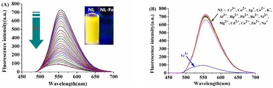 (A) Fluorescence titration of NL (10 μM) in the presence of different amounts of Fe3+ (0–20 μM) in DMSO/H2O (2:8/v:v, 20 mM HEPES, pH = 7.2) solution. Inset: Changes in fluorescence color of NL (10 μM) upon the addition of Fe3+ (10 μM). (B) Fluorescence responses of NL (10 μM) to different cations (20 μM): Cr3+, Cu2+, Ag+, Co2+, K+, Hg2+, Pb2+, Fe3+, Ba2+, Ni2+, Mg2+, Cd2+, Ca2+, Zn2+, Al3+, and Na+.