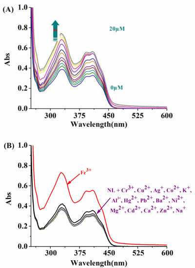 (A) UV-Vis titration spectra of NL (10 μM) in the presence of different amounts of Fe3+ (0–20 μM) in DMSO/H2O (2:8/v:v, 20 mM HEPES, pH = 7.2) solution. (B) Fluorescence responses of NL (10 μM) to different cations (20 μM): Cr3+, Cu2+, Ag+, Co2+, K+, Hg2+, Pb2+, Fe3+, Ba2+, Ni2+, Mg2+, Cd2+, Ca2+, Zn2+, Al3+, and Na+.