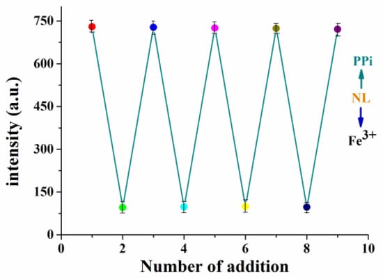 Regeneration is also an important factor to evaluate the performance of a fluorescent chemosensor. The fluorescence spectra of NL-Fe3+ (10 μM) were observed by adding PPi (30 μM) and Fe3+(10 μM) alternately in DMSO/H2O (2:8/v:v, 20 mM HEPES, pH = 7.2) solution, as shown in Figure 5. The reversible fluorescence transformation of NL-Fe3+ could be repeated more than 5 times, suggesting that NL can be used as a reversible fluorescent chemosensor for detecting PPi.