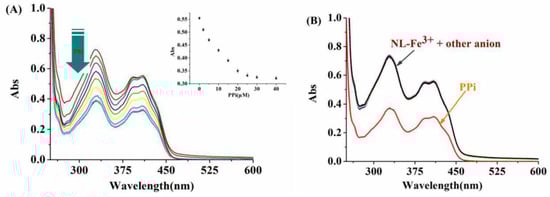 (A) UV-Vis spectrum of NL-Fe3+ (10 μM) toward different amounts of PPi (0–40 μM) in DMSO/H2O (2:8/v:v, 20 mM HEPES, pH = 7.2) solution. (B) UV-Vis spectrum of NL-Fe3+ (10 μM) towards various anionic analytes (40 μM): F–, Cl–, Br–, Ac–, HSO4–, SCN–, HCO3–, CO32–, S2–, NO2–, SO42–, AMP, ADP, ATP, PPi, and Pi.