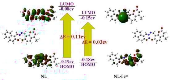Therefore, the reasonable complexion mode of NL and Fe3+ was proposed according to the above analysis results (Scheme 2). The results showed that Fe3+ chelates with the N atom of imino, O atom of hydroxy in naphthol as well as O atom of hydroxy in coumarin. The chelation pattern was confirmed by DFT calculations at the level of B3LYP using 6-31G (d,p) basis set for NL and LANL2DZ basis set for NL-Fe3+ complex using Gaussian 09 program. The configurations of NL and NL-Fe3+ complex and their corresponding energy levels of HOMO and LUMO molecular orbitals were depicted (Figure 7), the HOMO was distributed on the naphthalene ring of NL, and LUMO was distributed on the whole molecule of NL. Meanwhile, the π electrons in HOMO orbitals of NL-Fe3+ complex were distributed on the coumarin. The LUMO was distributed on the complexation part between the heteroatom and the iron in NL-Fe3+. The HOMO-LUMO energy gaps of NL and NL-Fe3+ were 0.11 eV and 0.03 eV, showing that the combination of Fe3+ and NL reduces the HOMO-LUMO energy gap of NL-Fe3+ and makes the system more stable.