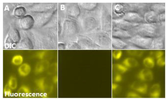 Due to its high sensitivity and biocompatibility, the potential application of biological imaging of PPi recognition in live Hep G2 cell was investigated. The cells were incubated with the DMSO/H2O (2:8/v:v, pH = 7.2) solution of NL (10 μM) in a CO2 incubator for 30 min at 37 °C. The cells were washed 3 times and treated with Fe3+(10 μM) for 20 min, then were incubated with PPi (30 μM) for another 20 min. As expected, Hep G2 cells cultured with NL showed strong yellow fluorescence (Figure 8A), while the fluorescence of cells treated with Fe3+ was quenched (Figure 8B), suggesting the formation of NL-Fe3+ complex in the cell. Then, the strong yellow fluorescence of cells was observed after further incubation with PPi (Figure 8C), which indicates that PPi could lead to the recovery of fluorescence by penetrating the living cell membrane and interacting with NL-Fe3+. This indicated that the NL-Fe3+ complex can be used to detect PPi in biological systems.