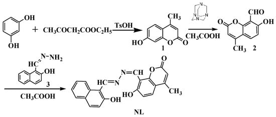 The synthetic route of probe NL is shown in Scheme 1, 4-methyl-7-hydroxy coumarin 1, 7-hydroxy-4-formyl coumarin 2, and naphthalene hydrazine 3 were prepared according to reported procedures [21,22]. A mixture of intermediates 2 (3 mmol) and 3 (3 mmol) were dissolved in 25 mL of acetic acid and refluxed until complete reaction of raw material. An orange precipitate appeared in the process of reaction; the filtered crude was purified by column chromatography to obtain a yellow solid NL (yield: 56%). 1H NMR (500 MHz, DMSO-d6) δ(ppm): 12.56 (s, 1H), 12.51 (s, 1H), 9.97 (d, J = 10.4 Hz, 1H), 9.33 (s, 1H), 8.64 (d, J = 8.2 Hz, 1H), 8.02 (d, J = 8.5 Hz, 1H), 7.89 (d, J = 8.2 Hz, 1H), 7.77 (d, J = 8.8 Hz, 1H), 7.64–7.57 (m, 1H), 7.42 (t, J = 7.3 Hz, 1H), 7.24 (d, J = 8.4 Hz, 1H), 7.00 (d, J = 8.6 Hz, 1H), 6.26 (s, 1H), 2.39 (s, 3H). 13C NMR (125 MHz, DMSO-d6) δ(ppm): 162.8, 161.9, 160.2, 158.9, 157.3, 153.6, 135.1, 132.2, 129.7, 128.7, 128.0, 127.7, 123.7, 121.9, 118.7, 118.6, 113.3, 111.8, 110.7, 108.2, 105.2, 18.1. FT-MS, m/z: 373.11879 (M+H+); Anal. Calcd for C22H16N2O4: C, 70.96; H, 4.33; N, 7.52. Found: C, 70.91; H, 4.35; N, 7.56.