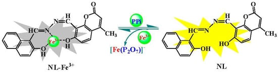 The following are available online at https://www.mdpi.com/2227-9040/9/3/48/s1, Figure S1: 1H NMR of NL, Figure S2: 13C NMR of NL, Figure S3: FT-MS of NL, Figure S4: FT-MS of NL-Fe3+ complex, Figure S5: IR of NL-Fe3+ complex, Figure S6: UV-Vis of NL-Fe3+ complex, Figure S7: FT-MS by adding Fe3+ into NL, Figure S8: FT-MS of NL-Fe3+ + PPi, Figure S9: Fluorescence spectra of NL at different times, Figure S10: Fluorescence intensities of NL as a function of Fe3+ concentration, Figure S11: Fluorescence response of NL to Fe3+ in the presence of other common metal ions, Figure S12: The Benesi–Hildebrand of NL with Fe3+ by UV-Vis spectroscopy, Figure S13: The Job’s plot of the reaction between NL and Fe3+ by UV-Vis spectroscopy, Figure S14: Fluorescence response of NL-Fe3+ in the presence of various analytes, Figure S15: Fluorescence spectra of NL, sequential upon addition of Fe3+ and PPi, Figure S16: The linear responses of NL-Fe3+ versus the concentration of PPi, Figure S17: The decomplexation constant of NL-Fe3+ toward PPi by fluorescence titration, Figure S18: The fluorescence response time of NL-Fe3+ in the presence of PPi, Figure S19: The decomplexation constant of NL-Fe3+ toward PPi by UV-Vis spectroscopy, Figure S20: Fluorescence intensity of NL-Fe3+ in the absence and presence of PPi at various pH values, Figure S21: Cell viability values assessed using an MTT proliferation test versus incubation concentrations of NL, Figure S22: MTT assay of Hep G2 cells treated with NL-Fe3+.