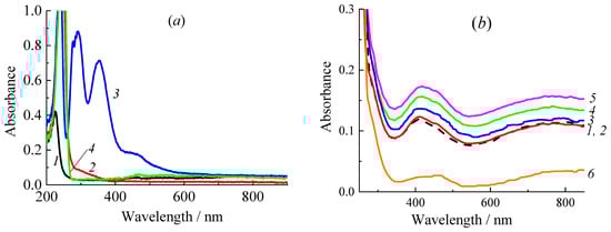 Representative UV–Vis spectra obtained for (a) individual components of the synthesis: 1—1.5 mM CuSO4, 2—10 mM Py, 3—0.5 mM I2, 4—3 mM KI; (b) the multiple mixture at the initial (1) synthesis time and after a complete reaction route (shown for the sample 4 as a case study): 2—1 h, 3—2 h, 4—3.5 h, 5—after 5.5 h, 6—24 h.
