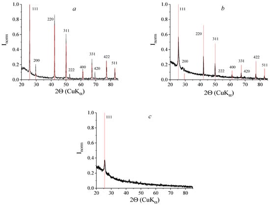 XRD-pattern recorded from the rinsed CuI-PPy samples: (a)—1–5, (b)—6, (c)—7. Bars corresponded to CuI structure in accordance with JCPDF N° 83–1137. Note: the halo in the area of 20° is corresponding to the presence of amorphous PPy.