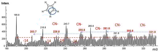 To this end, the synthesized samples were investigated by LDI–MS, according to a previously reported protocol [37]. The mass spectrum obtained from the hybrid sample in negative ionization mode, clearly exhibited by CN−, corresponded repeatable ion species, Figure 5.