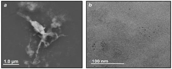 (a) SEM image of the CuI-PPy composite (sample 4) formed by the use of the ink stored for 6 weeks; (b) TEM image of the rinsed ink after its storage in darkness in aqueous solution at the ambient conditions during 6 weeks.