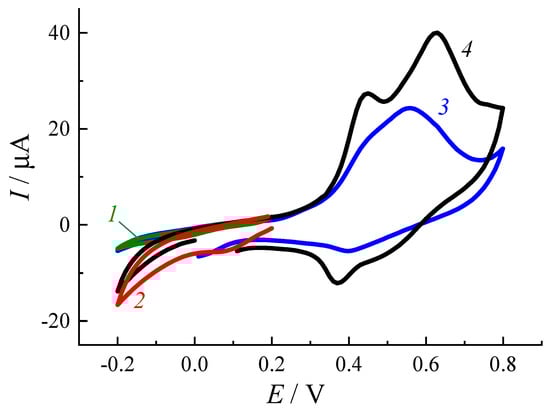 CV curves obtained in buffer (pH 7) at 20 mV/s from (1, 3) SPE/GO and (2, 4) SPE/TiO2 modified by 3 µL CuI-PPy (drop coating) at different anodic limits: 1, 2—0.2 V; 3, 4—0.8 V, respectively.
