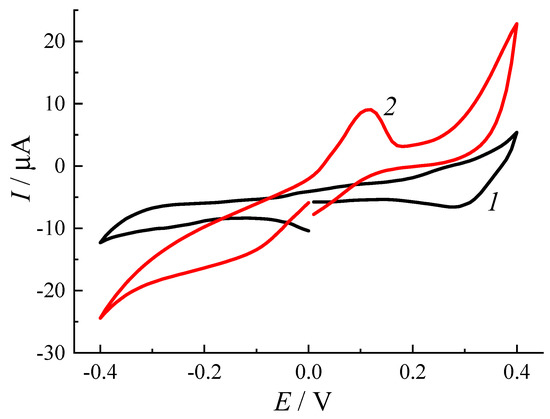 CV curves recorded in the range of −0.4 V to 0.4 V in the presence of analyte clearly demonstrate the electrochemical response of the hybrid composite toward GLU sensing; see Figure 12. Thus, the presence of analyte in a buffer solution resulted in the appearance of the anodic peak at 0.15 V indicating GLU oxidation on the surface of CuI-based composite. It is interesting that cathodic current in the range 0 to −0.4 V is also increased.