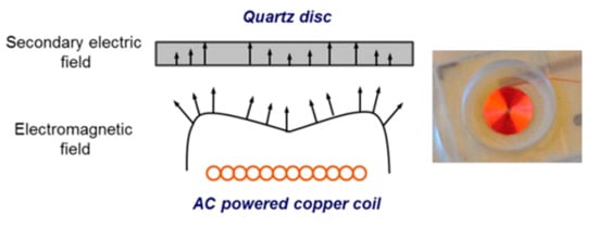 Excitation of quartz disc via the secondary electric field from an AC-powered copper coil (shown on the right).