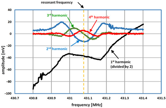Measuring the harmonic components of the signal (Figure 3) found the modulating signal (fAF) was 410 Hz, the deviation of the modulation (fdev) was 125 kHz. The high frequency signal was stepped with 2 kHz between measurement points. Each point was calculated from an 800 ms long record. The curve of the 1st harmonic contains considerable interference; however, the supposed inflexion point at the resonant frequency is visible. In contrast, the curves corresponding to the higher harmonic components show clear features. The zero crossing of the 3rd harmonic allows the detection of the resonant frequency while the peak values of the 2nd and 4th harmonic components permits the calculation of the quality factor Q.