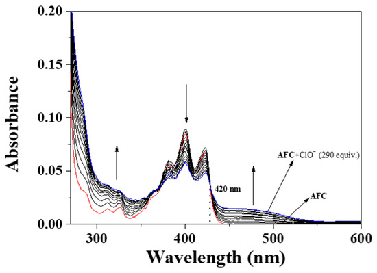 UV–VIS change of probe AFC (1 × 10−5 M) with different amounts of ClO−.