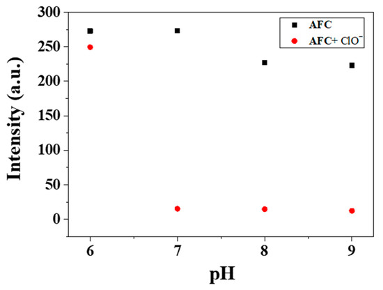 Fluorescence emission (at 455 nm) of AFC with ClO− at pH 6–9.