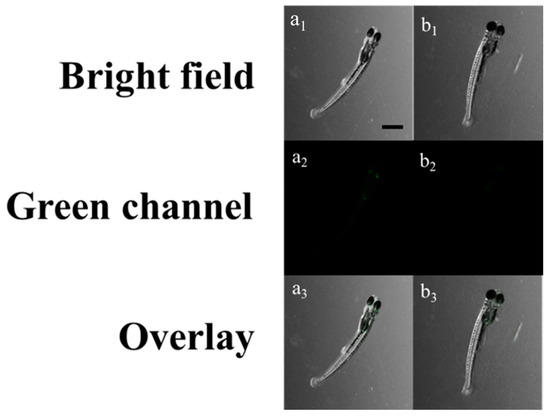 Fluorescence images of zebrafish (6 days old) treated with AFC followed by the addition of ClO−. (a1–a3): AFC only; (b1–b3): AFC with 5 × 10−5 M ClO−. [AFC] = 5 × 10−5 M.