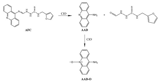 A novel thiosemicarbazide-based chemosensor AFC for detecting ClO− was synthesized from the reaction of aminoacridine and a new aldehyde group synthesized from formic hydrazide. Probe AFC selectively recognized ClO− over other anions including ROS in aqueous solution. With ClO−, probe AFC showed remarkable fluorescence quenching. The limit of detection of AFC for ClO− was calculated to be 58.7 μM. Additionally, probe AFC could be applicable for quantitative analysis in real water samples and zebrafish. Importantly, AFC is the second fluorescent turnoff sensor for ClO− applicable to both real water samples and zebrafish. The dependable results in this study shows that AFC could be used as an efficient chemosensor for detecting ClO− in aqueous solution and small organisms by a fluorescent quenching method.