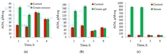 The results of determining AOA of a volunteer’s skin (a young woman) in the areas without application (control) and after application of the analyzed phytocosmetic product are given in Figure 3 and Figure 4. The time of data collection equal to the duration of exposure of phytocosmetic products on the volunteer’s skin was selected as a length of an average working day. All the analyzed phytocosmetic products demonstrated their effectiveness both in vitro (see Table S5 in Supplementary Materials) and in vivo assays (Figure 3 and Figure 4).