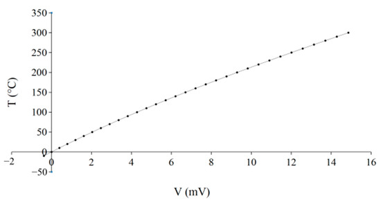 Consider, for example, a thermometer based upon a copper-Constantan Type T thermocouple equipped with a sample junction, a water-ice reference junction, and a high-impedance digital multimeter set to measure voltage (see Figure 3). The desired operating range of this thermometer is chosen to be 300–320 K. Data from a Type T thermocouple standard data table [3] over the range 280–340 K, which extends above and below the desired operating range, is fit to the polynomial in Equation (7) as shown in Figure 5.