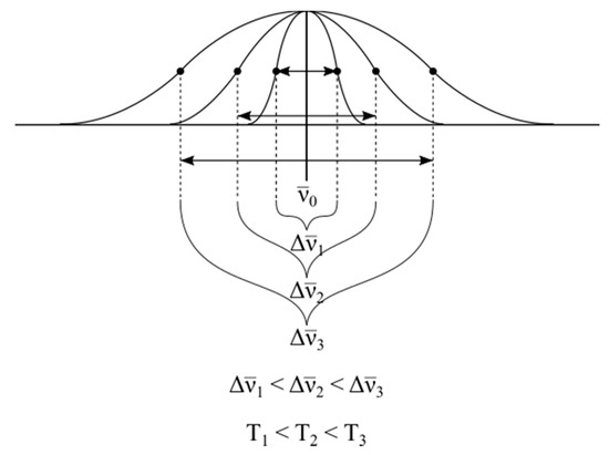 Numerous exciting new developments in thermometry involve the use of temperature-dependent photoluminescence phenomena as indicators of temperature [4]. In some cases, classic temperature measurement techniques based upon an analysis luminescence induced by a broad-band excitation source, are transformed by switching to monochromatic laser excitation. A notable example involves the extraction of sample temperature from laser-induced thermally broadened Doppler luminescence spectral profiles, as shown in Figure 7 [5]. The temperature T of the luminescing sample is determined by inserting the measured spectral bandwidth Δ ν ¯ of the emission at together with the measured band maximum ν ¯ 0 and solving for T in Equation (8)
