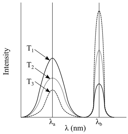 In photoluminescence thermometry, only excitation photons impinge on the sample. No physical or mechanical contact needs to be made between the thermometer and the emitting surface of the sample whose temperature is being measured. Moreover, temperature mapping of a small sample (biological, chemical, electrical, mechanical) is limited in spatial resolution only by the diameter of the excitation laser beam. High thermal resolutions are readily achievable. Intensity-based ratiometric luminescence thermometry becomes possible when a sample emits light from bands centered at two different wavelengths, λa and λb, where the intensity ratio of the two bands Ia/Ib varies smoothly and monotonically with variations in the sample temperature [6,7,8]. The intensity ratio thermometer is calibrated by measuring Ia/Ib of a standard at a series of known temperatures. A plot of the experimentally determined R = Ia/Ib luminescence intensity ratio of the sample vs. temperature, expressed as a power series to give the fitting coefficients a, b, c, d …, yields the desired temperature