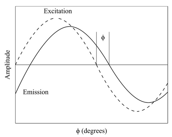 Figure 10. Luminescence lifetime τ via the phase shift ϕ of sinusoidally modulated emitted light with respect to sinusoidally modulated excitation light.