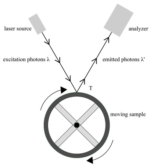 Figure 11. Non-contact thermometry based upon temperature-dependent, laser-induced luminescence of a rapidly rotating sample. Only excitation photons impinge on the sample. No physical or mechanical contact with the sample is required [19].