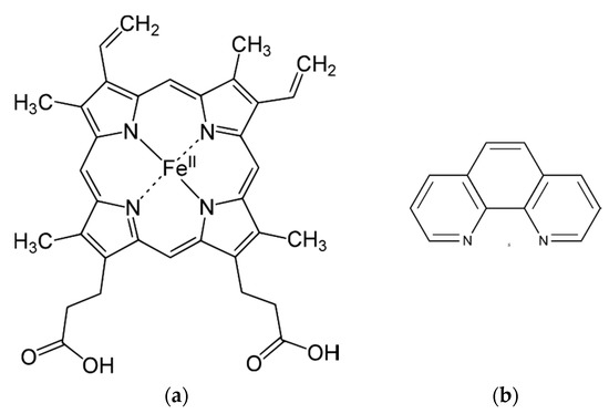 Figure 12. Examples of conjugated π orbital systems. (a) heme B, (b) 1,10-phenanthrolene, (c) 2,2′-bipyridine, (d) ruthenium(II) tris (2,2′-bipyridine).