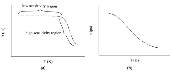 Figure 16. For some systems, the luminescence lifetime τ decreases with increasing temperature. For sensitive higher temperature measurements, it is best to use a chromophore (a) for which | d τ / d T | is large (e.g., Ln3+ doped materials such as YAG:Dy3+ (see Figure 8 Ref. [19]). For sensitive lower temperature measurements, it is best to use a chromophore (b) for which | d τ / d T | is large at lower temperatures (e.g., ruby, Al2O3:Cr3+) [34,35,36].