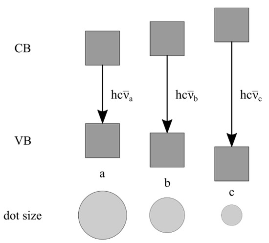 Figure 17. Luminescent quantum dots (QDs) showing the correlations between quantum dot size, the band gap between the conduction (CB) and valence bands (VB), and the photon emission energy.
