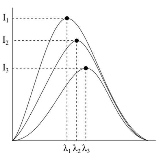 Figure 18. Schematic of near IR luminescence spectra of PbSe QDs showing peak wavelength and intensity trends: peak wavelengths λ1 < λ2 < λ3, peak intensities I1 > I2 > I3.