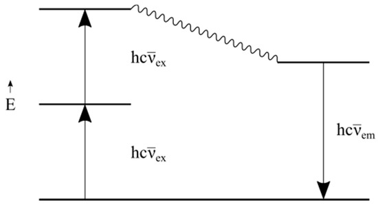 In Equation (8), Δ ν ¯ F W H M is the full width at half maximum of the luminescence band in wavenumbers (cm−1), k is the Boltzmann constant, m is the mass of a single emitting atom or molecule in the sample, c is the speed of light, and ν ¯ 0 is the experimentally determined emission band maximum expressed in wavenumbers, and T is the absolute temperature of the sample.