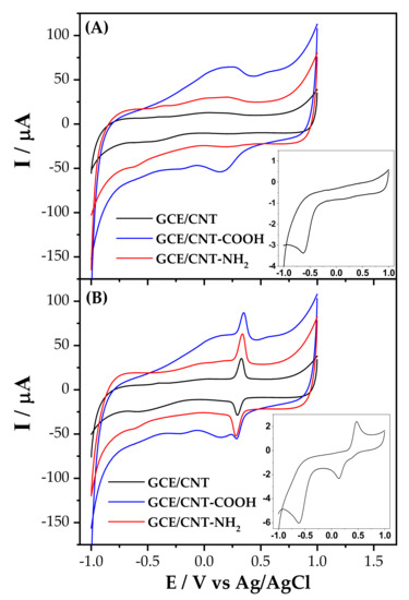 Glassy carbon electrodes (GCE, model CHI104) were modified using different multi-walled carbon nanotubes separately: carbon nanotubes without functionalization (MWCNT) and functionalized with -COOH and -NH2 groups (MWCNT-COOH and MWCNT-NH2, respectively), all of them were provided by Dropsens. MWCNT dispersions were prepared in an Elma S 10 Elmasonic ultra-sonic bath with a concentration of 1.0 g L−1 using water MilliQ as a dispersive agent. GCE was pre-cleaned by polishing using alumina powder of 0.3 and 0.05 µm consecutively and then washed with abundant Milli-Q water.