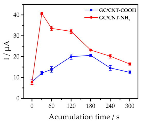 The effect of accumulation time on the current intensity was studied for the systems GCE/MWCNT-COOH and GCE/MWCNT-NH2 (Figure 2). For both systems, an increase of the current was achieved with the accumulation time until reaching a maximum value, and then the current decays. The maximum current was achieved at 180 s and 30 s for GCE/MWCNT-COOH and GCE/MWCNT-NH2, respectively. During the accumulation time, large amounts of HQ molecules are rapidly adsorbed to the surface of the carbon nanotubes due to strong electrostatic forces at the start of the adsorption process. The decrease in current obtained after the optimal accumulation time can be explained due to the gradual occupation of the MWCNT surface by the HQ molecules, where competitive adsorption is inevitable. The HQ molecules that are not absorbed diffuse from the outer Helmholz plane towards the bulk of the solution, increasing the adsorption resistance and decreasing the adsorption rate of HQ. Furthermore, it can be seen that under the same conditions, MWCNT-NH2 presents a higher adsorption capacity, indicating that the conditions are favorable for HQ adsorption. This property would improve the migration of the analyte to the electrode surface, in addition, to provide a larger surface for the accumulation and formation of double electrical layers, resulting in more sensitive electrochemical signals for the detection of these species in aqueous matrices. Accordingly, the following studies were performed using an accumulation time of 180 s and 30 s for the systems GCE/MWCNT-COOH and GCE/MWCNT-NH2, respectively. Similar results were observed for the oxidation of CT under the same experimental conditions.
