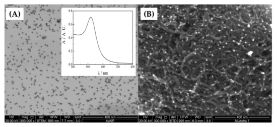 Before using AuNPs in the electrochemical system, they were characterized by TEM, UV-Vis-NIR spectroscopy and Dynamic Light Scattering. TEM analyses (Figure 3A) showed that AuNP presents a homogeneous and quasi-spherical shape, and their size is between 12–13 nm with an average size of 12.7 ± 2 nm. The size was confirmed by UV-VIS-NIR (inset Figure 3A) analysis, which shown a maximum of the band at 518 nm. This value corresponds to symmetric surface plasmon absorption and quasi-spherical particle of 12–18 nm [26,50]. DLS analyses (Figure S2) agree with the AuNP size with a 12.7 ± 2 nm value. The MWCNT-NH2 and AuNP mixture was characterized using SEM (Figure 3B), and images showed that AuNP was dispersed homogeneously on the MWCNT-NH2 surface, which indicates a good interaction between the nanospheres and the amino groups present in the nanotubes, enabling the electrostatic deposition of the AuNP on the rough surface of the functionalized MWCNTs.