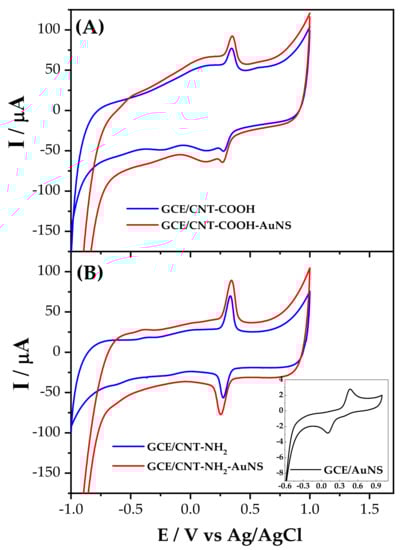 The effect of the AuNP towards the HQ detection using MWCNT-COOH and MWCNT-NH2 was studied using cyclic voltammetry (Figure 4A,B, respectively). An increase of faradaic current was observed using AuNP and the different MWCNTs; however, more reversible and defined current peaks were obtained for the HQ/Q couple using GCE/MWCNT-NH2-AuNP. As seen in Figure 3B, good interaction between AuNP and MWCNTs was assessed, which would create a synergistic effect on the HQ detection, thereby generating an increase in the current due to a better electronic transfer attributed to the contribution of both materials. The different peak potentials and currents for the HQ oxidation using both systems are summarized in Table S2. A poor signal was observed using only GCE/AuNP (Inset Figure 4B), which could be attributed to (i) the incapacity of GCE’s surface to adsorb AuNP due to the lack of functional groups that promote the electrostatic interaction between the nanoparticles and the surface of the electrode, and (ii) AuNP present a smaller surface area compared to the electrodes modified with MWCNTs.