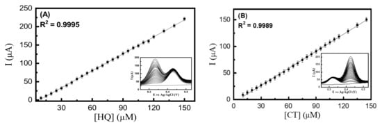 To assess the interference in the simultaneous determination of HQ and CT, we proceeded to study the oxidation of both analytes by DPV, considering that HQ and CT have an oxidation peak separated by 100 mV when analyzing each analyte alone using DPV. Figure 5A shows the voltammograms of different HQ concentrations with a constant concentration of CT 50 μM. The peak current is increased linearly when increasing the concentration of HQ in a range of 4.25–150.00 μM with R2 = 0.9995 and a Fexp= 0.0004 (Critical F [0.05,72,52] = 1.53) with a linear equation of Ip (μA) = −12.796 + 1.539 [HQ] (μM). The same procedure was followed for the CT calibration curve, keeping a constant HQ concentration of 50.0 μM.