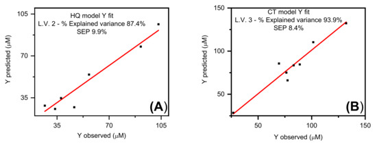 A model based on PLS was built for the determination of HQ and CT in industrial residues of the wine industry. Best results were obtained by applying a baseline correction and log10 to compensate the dispersion of the baseline current between each measurement made due to the reproducibility of the electrodes. Voltammograms were preprocessed, and a mean center was applied to avoid variation of the oxidation potential of HQ and CT between the measurements for the fortified samples. Two latent variables were selected for the HQ model and 3 latent variables for the CT model. This number of variables exhibits the lowest validation errors by cross-validation, allowing a more accurate determination because this number of components delivers a lower residual error. In addition, the analytical figures of merit were obtained for each model based on the PLS model obtained. These results are presented in Table S4. From the information obtained from the multivariate model, HQ and CT can be determined simultaneously in a range of 1.0–126.0 μM for HQ and from 7.0–177.0 μM for CT, with calibration and validation errors close to 20% obtained by cross-validation. The PLS model was evaluated using an 8-sample validation set for wine industry wastewaters, fortified with known analyte concentrations. Standard prediction errors (SEP) of 9.9% were obtained for HQ quantification and 8.4% for CT in simultaneous quantification of both analytes in the wastewater. The charts with the values of SEP and the HQ and CT real concentrations versus predicted concentrations of both analytes are presented in Figure 6. This figure shows graphically the correlation between the known analyte concentrations (Y observed) and the concentrations predicted by the model (Y predicted), where the line represents the predicted ideal values when evaluating the voltammogram obtained by DPV in the vector of regression B, where greater proximity of the points to the line indicates a good accuracy in the prediction of the concentration. According to the results obtained, the values predicted by the PLS model are concordant with the concentrations added to the real sample, having a low prediction error.