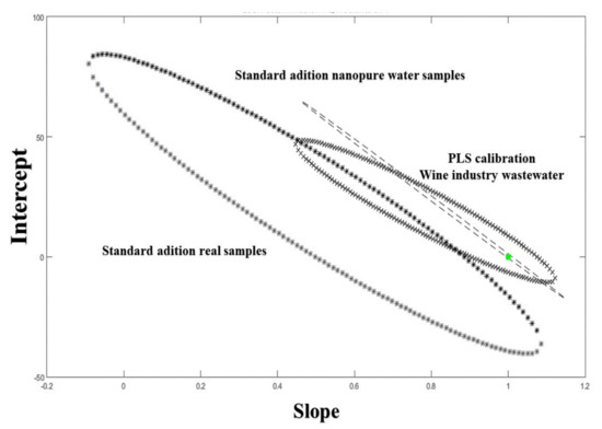 Elliptical joint region (at 95% confidence level) for the slope and intercept of predicted vs. nominal concentrations predicted by standard addition and the PLS model developed in this work. The green cross marks the theoretical (intercept = 0, slope = 1) point.