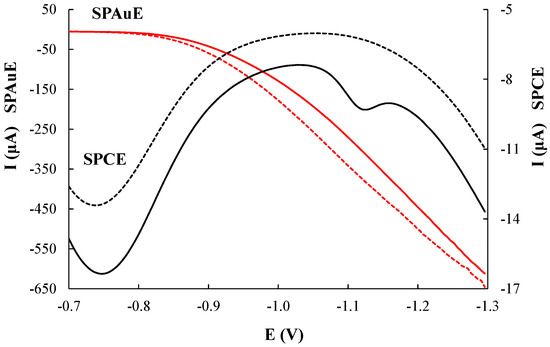DPAdSV measurements of a solution containing 10 µg L−1 Ni(II) at pH 9.2 and 5 × 10−5 mol L−1 DMG were done at several Ed and td values varying from −0.6 V to −1.0 V and from 30 s to 240 s, respectively, searching for a compromise between both the analytical response and the time of analysis. A well-defined Ni(II) peak close to −1.1 V that proportionally increased with td until 120 s was obtained using a SPCE (Figure S1). For longer td a diminution of peak area was progressively observed. Therefore, the highest analytical response was achieved applying a Ed of −0.7 V and a td of 120 s as a good agreement between the analytical response and the analysis time. However, when a SPAuE was used, the characteristic Ni(II) peak was not observed either in any of the Ed values tested or td applied. Instead, a background signal was found whose current dramatically increased as the potential was getting more negative (Figure 1), surely due to the H2 discharge. Indeed, gas bubbles were detected on the electrode surface at the most negative potentials. In view of these results, the use of a SPAuE was discarded as a sensing unit for the DPAdSV determination of Ni(II) and, from here on out, SPCE was used.