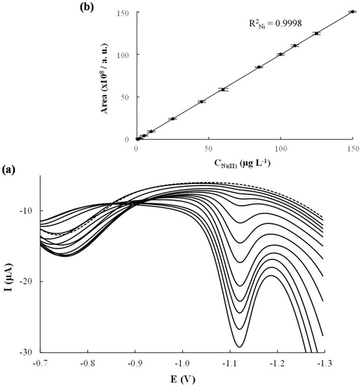 (a) Adsorptive voltammograms and (b) calibration plots of Ni(II) using a SPCE in 0.1 mol L−1 ammonia/ammonium buffer solution (pH 9.2) and 5 × 10−5 mol L−1 dimethylglyoxime (DMG) applying a Ed of −0.7 V and a td of 120 s. Blank signal in dashed line. In (b) error bars of the peak areas are shown.