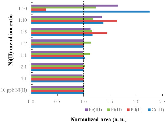Effect of different Ni(II): metal ion ratios on the Ni(II) peak area. Co(II), Pd(II), Pt(II) and Fe(II) were considered as potential interfering metal ions.