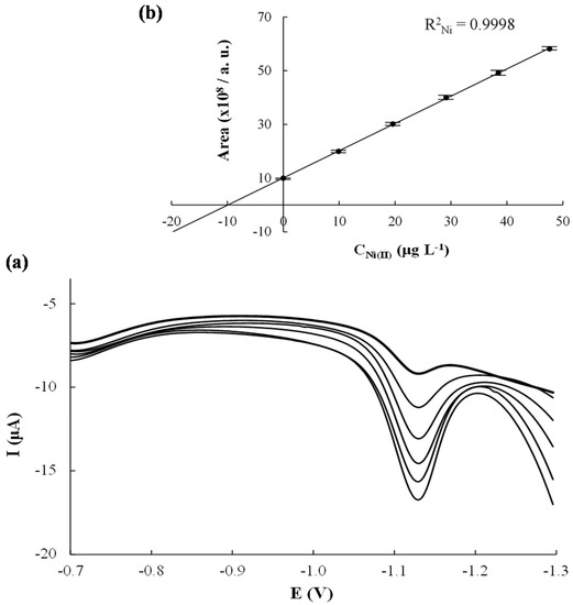 The analytical performance evaluation was conducted by means of DPAdSV calibration of Ni(II) metal ion performed in triplicate (a new SPCE unit was used in each replicate). Linear calibration curves were carried out at the optimized conditions by analyzing thirteen Ni(II) concentrations increasing from 0.5 to 150 µg L−1. As it can be seen in Figure 2a, a well-shaped Ni(II) voltametric stripping peak close to −1.1 V that increases with the Ni(II) concentration was obtained. As shown in Table 1 and Figure 2b, good linear responses of peak area vs. Ni(II) concentration was attained.