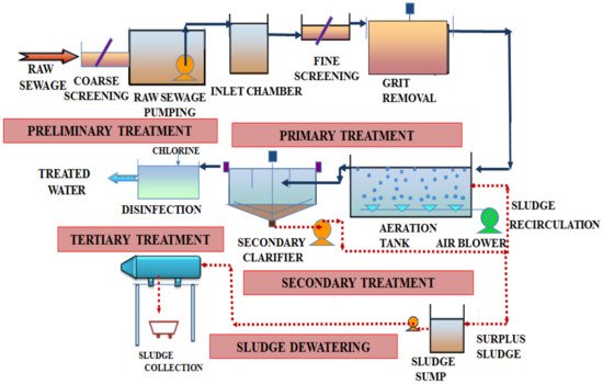 Based on physical, chemical and biological impurities the water will be treated and the treatment rely on the pollutants present in the water. Physical treatment includes removing impurities by physical processes such as screening, gravity settling, mechanical straining and skimming. Chemical treatment is usually preferred for treating industrial wastewater. There are many methods in achieving chemical treatments including coagulation, chemical precipitation, oxidation and reduction, neutralization and ion exchange [9]. Biological treatment is carried out using microbes to break down the organic matter in the waste water. As the sewage treatment includes both chemical and biological processes, organic content such as Biological Oxygen Demand (BOD) and Chemical Oxygen Demand (COD) have to be properly measured before being let into water bodies. Oxygen used by microorganisms to decompose the organic matter is denoted by BOD. COD denotes the level of oxygen used for oxidation. The measurement of BOD and COD values is important to access the toxins and biologically resistant organic substances. The composition of raw inlet sewage affects the intensity of treatment that comprises many complicated functions. Sewage treatment mostly constitutes the following stages (i) Preliminary treatment (ii) Primary treatment (iii) Secondary treatment (iv) Tertiary treatment as shown in Figure 1.