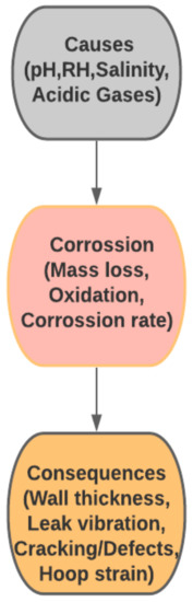 In light of past investigations, water and sewage pipelines can be isolated into wastewater (gravity) sewers, wastewater power mains and measure lines in cleansing plants. They are constructed with different sorts of materials, constituting ferrous (counting ductile iron, solid metal and steel), concrete (counting strengthened concrete, porcelain-based structures including brick and clay) and plastic materials. Among them, concrete is a vital material in the manufacture of foundations that plays a primary role in the construction of structures processing storm-water waste and sewers [11,12]. Sewage pipelines are largely exposed to brutal ecological conditions including corrosive, biofouling environment and other destructive assaults that result in deterioration of the infrastructure. Metropolitan wastewater is comprised of homegrown, modern and metropolitan overflow sewage that consists of water (>95%) and different kinds of poisons [13]. Commonly, homegrown wastewater is made out of numerous pathogens and non-pathogenic microorganisms, natural/inorganic synthetics, suspended, broken up mixes and so forth [14]. Acidic and sulfide exposure of pipelines caused by microbial activities is the major reason behind biological and chemical corrosion [15]. Corrosion is generally termed as an unwanted characteristic cycle bringing about the slow demolition of materials including metals, concrete, etc. through chemical or electrochemical responses with the contiguous atmosphere [16]. Corrosion influences the quality of the material, rigidity, out looking and its performance. The reaction of elements with their surrounding structure causes various erosion problems including pitting of tubes, deterioration of various parts and corrosion fatigue. It is perceived that corrosion type and seriousness are emphatically relying on the surrounding environment, for which the marine climate is viewed as an important infrastructural deterioration [17,18].