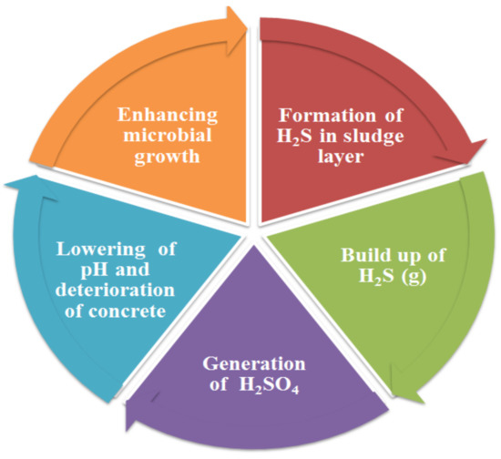 Bacteria of the genus Thiobacillus is the generic bacteria in the decontamination plant which can oxidize sulfide, elemental sulfur, thiosulphate and polythionates. It includes two forms, one is a constraint to oxidize sulfur to and survive at neutral pH and another one which develops at lower pH use as an electron donor [15]. MIC is a very significant type of disintegrating mechanism for concrete structure exhibit in sewer environments that greatly affects the lifespan of concrete structures [28,29] and may reduce the life time from 100 years down to 30–50 years in worst cases down to 10 years or fewer [29,30]. Initially, it was conceived that the formation of due to oxidation of was entirely a chemical process. Various works were performed to reveal the process or events involved in MIC. Parker revealed the impact of microorganisms in the corrosive process through the interconnection of gas and the existence of sulfuric acid [31]. The process governing the commencement of MIC in the sewer system has been partitioned into several steps/stages according to different investigators. The widely accepted flow process is shown in Figure 3 and summarized below [32,33,34].