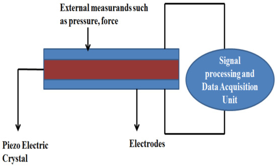 The electromechanical sensor transforms mechanical stimulus into electrical signals. There are various types of electromechanical sensors including capacitive, resistive and piezoelectric. Micro-Electro-Mechanical Systems (MEMS) based on cobalt have been demonstrated for direct monitoring of phosphate in small microbial aggregates for in situ measurement within excited sludge for improved biological phosphorus eradication process [48]. Changes in factors such as acoustic emission, temperature, force, pressure, strain, or acceleration can be analyzed in terms of electric charges through piezoelectric-based sensors. Ceramic materials are the leading material used for the conversion of electrical energy into mechanical energy and vice versa. They possess reliable and rigidity over an extreme range of temperatures. The piezoelectric patches and smart patches were deployed for structural health monitoring, reconstruction and vibration damping [49,50,51]. Piezoelectric technology is mostly used in chemical sensors to carry out inexpensive real-time monitoring. The basic setup of piezoelectric-based sensors is shown in Figure 4. Based on Piezoresistivity principle, self sensing concrete were demonstrated for stress/strain detections through electrical resistivity of concrete made of polymer matrix composites. With the advent of Polymer matrix composites with electrically conductive elements such as carbon fiber (CF), carbon particle reinforced polymers, or hybrid composites made of aramidic/carbon or glass/carbon, Self sensing concretes were explored [52,53]. Similarly self sensing concretes based on capacitive effect also explored in [54]. Self sensing method is indeed in its early stages. Further research is needed to explore sensing repeatability and sensing activity in hostile climates.