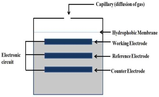 Electrochemical devices transform the electrochemical reaction at analyte-electrode into an electrical signal. Depending on the variations in the potential difference, current flow and the conductivity of thin film it is classified as potentiometric, amperometric and conductometric sensors. The basic schematic of electrochemical sensor is shown in Figure 5. Nanocomposite-derived sensors based on various inorganic electrocatalysts including CuO/AgO agents show good correlation and response towards COD detection [62]. Sensors for pH detection based on electrochemical interaction is also widely in practice for harsh environment. Metal oxides-based pH sensors seeks greater importance because of their increased sensitivity, fast response time (<10 s), long lifetime (>1 year), ease of miniaturization, consistent in distinct atmospheres and biocompatibility [63]. Sewage treatment plants exhibit many toxic gases, including sulphide, , carbon dioxide, nitrous oxide and in-sewer gases that cause environmental emissions. Electrochemical-based sensors to detect nitrous oxide in a low-range from the gas stream are reported [64,65]. At a series of frequencies, the conductivity of a thin film or bulky material was traced to measure humidity through the conductivity of mixed oxide [66].