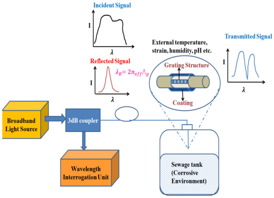 The tremendous growth in fiber optic communication and recent advances in optoelectronic devices lead to the development of fiber optic-based sensors. The optical sensors are based on monitoring variations in the guiding light attributes including amplitude, phase, frequency and polarization. Compared with other sensing technologies, optical fiber sensors have inherent characteristics such as increased sensitivity, compressed size and weight and resistance to Electro-Magnetic Interferences (EMI) [74,75,76,77,78,79]. Various experimental work has been carried on optical sensors based on the interferometric, Surface Plasmon Resonance (SPR), Fiber Bragg Grating (FBG), distributed grating, resonators and Lossy Mode Resonance (LMR). Among various techniques, sensors based on FBG are greatly influenced in SHM and the FBG structure was first discovered by Hill et al. [80]. After the discovery of FBG structure. Morey et al. [81] fabricated the FBG structure by exposing the fiber under UV light so that the intense interference pattern created leads to a structure with a periodically varied refractive index. The light at a particular wavelength is reflected at each refraction change and all the reflected signals having the same wavelength called Bragg wavelength are combined coherently. The remarkable achievements on various transducers have been reported only after the fabrication of FBG sensors by Morey et al. [81]. Any variations in strain and temperature experienced by the grating can be easily measured with the change in the wavelength of reflected light. Other external factors affecting RI, strain and temperature around the FBG can also be monitored. The principle of FBG sensing technology is shown in Figure 6.
